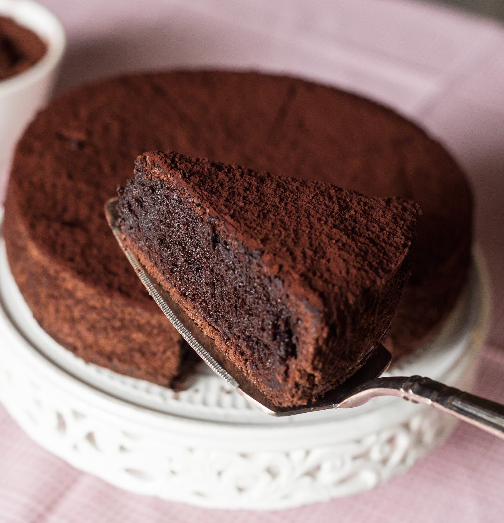 Ciasto w stylu brownie. Wnętrze ciasta wilgotne, czekoladowe, mąkę zastąpiono mielonym orzechem laskowym.