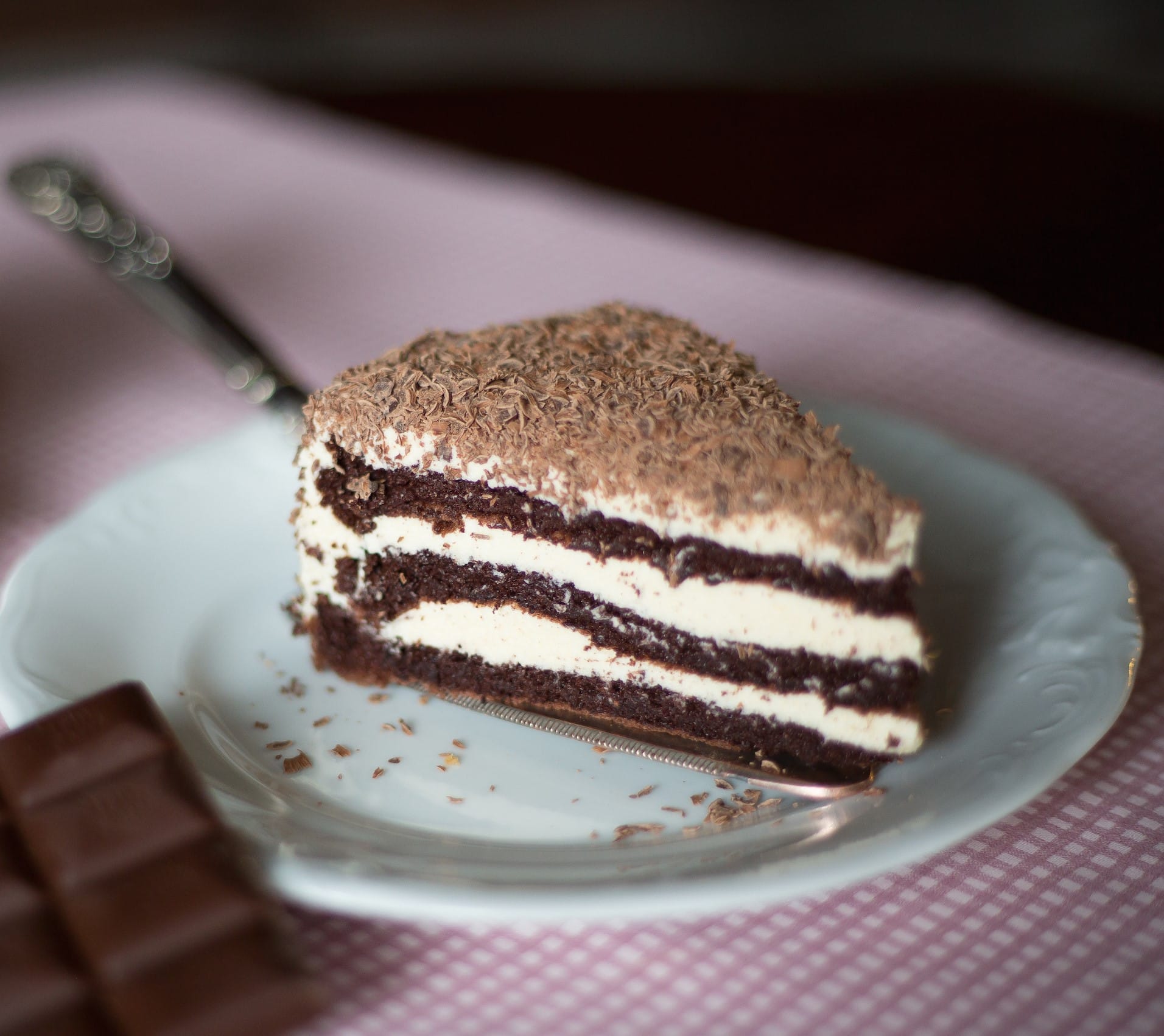 Mocno czekoladowe cienkie biszkopty przełożone kremem maślano-budyniowym. Budyń przygotowany jest na bazie mąki kukurydzianej. Całość obsypana tartą, deserową, bezglutenową czekoladą.