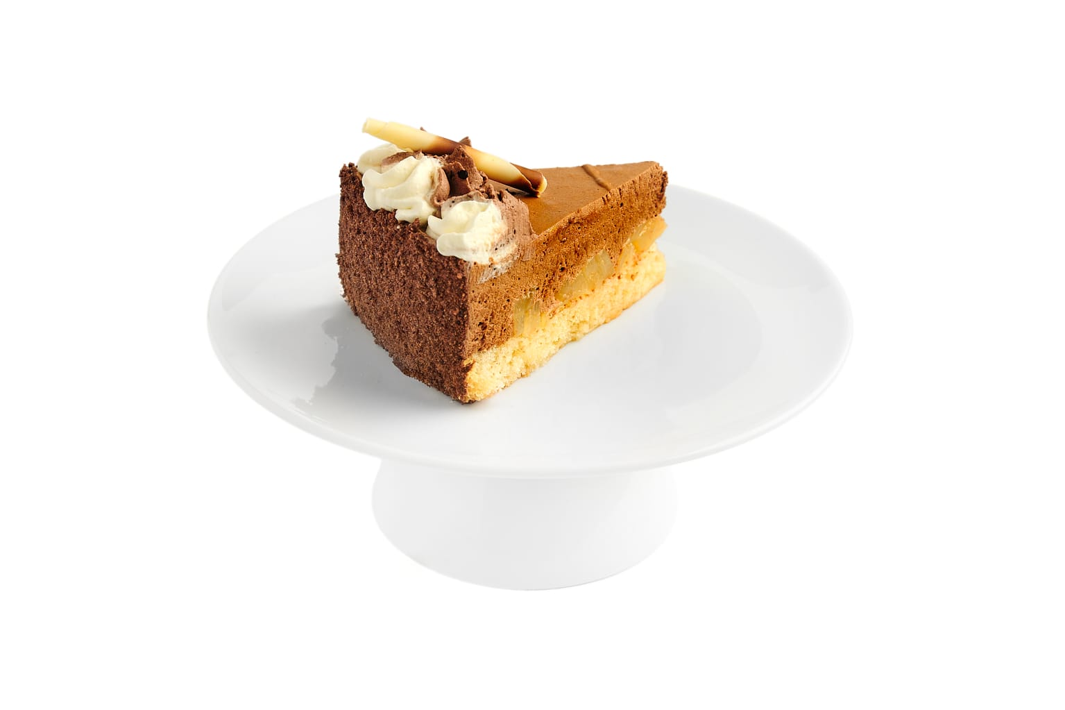 Gruszka z kompotu ułożona na jasnym biszkopcie, zalana czekoladowym musem.