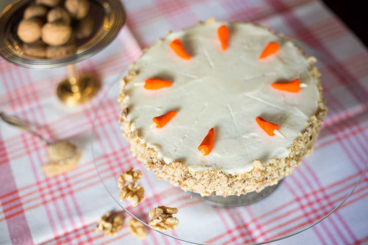 Ciasto marchewkowe z dużym udziałem orzechów włoskich oraz z dodatkiem cukru trzcinowego i przypraw korzennych, otoczony kremem waniliowym, ozdobiony marcepanowymi marchewkami.